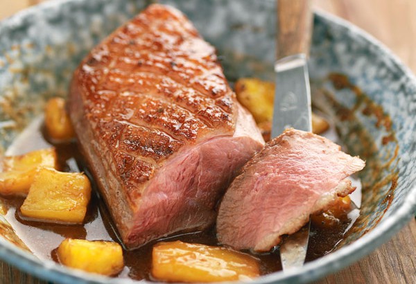 4. Cut the duck into thin slices, arrange on warmed plates. Add the diced pineapple. Drizzle with sauce. Serve immediately.