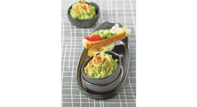 3. Pour the tahini, lemon juice, zucchini and garlic in the bowl of a mixer. Mix until a fine and smooth purée. Add the chili powder and coriander, salt and pepper. Keep in the fridge and decorate with flaked almonds before serving.