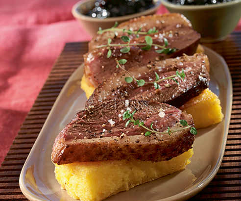 3. In the same skillet, brown the polenta rectangles on both sides. Cut the duck breast into slices.