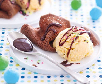 4. In a plate, spread the mini crepes with the melted chocolate. Sprinkle with chocolate chips and top with white chocolate ice cream