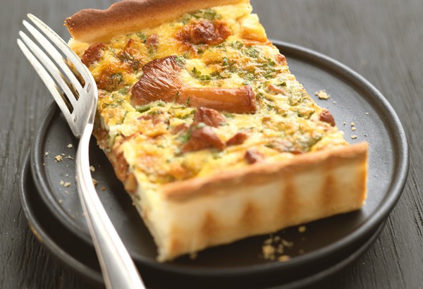 3. Roll out the pastry with parchment paper lined into a tart pan. Prick the dough with a fork. Divide the mushrooms into the tart shell and pour the mixture. Bake for 25 minutes. Serve warm.
