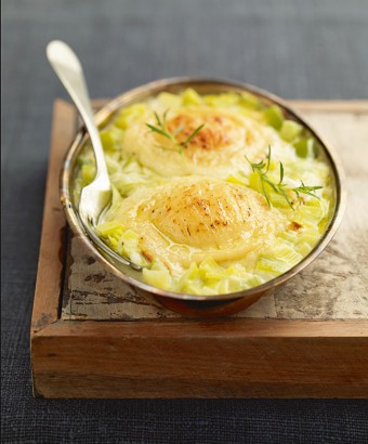 3. Preheat the oven at th. 7 – 210 °C. Wash and dry the chervil sprigs. Divide the leek fondue into 5 oven ramekins